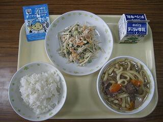 本日のメニューは、ご飯、牛乳、すこやかふりかけ(わかめ)、肉うどん、ごぼうサラダでした。