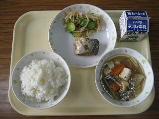 本日のメニューは、ご飯、牛乳、サバゆず味噌煮、レモン和え、のっぺい汁でした。