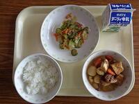 しろごはん、いわしのかんろ煮、さといものにころばかし、わかめのみそ汁、牛乳