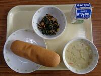 米粉パン、鶏肉のエスニカン、ほうれんそうのソテー、牛乳