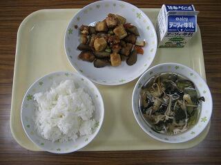 本日のメニューは、ご飯、牛乳、チキンチキンごぼう、チンゲンサイのスープでした。