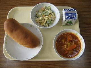 本日のメニューは、黒糖パン、牛乳、ミネストローネ、マカロニサラダでした。