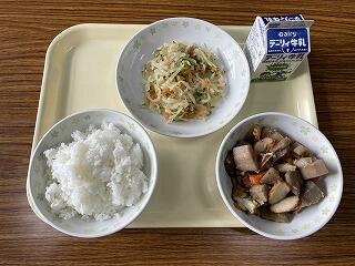 本日のメニューは、ご飯、牛乳、ちくぜん煮、紅白なますでした。