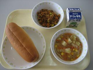 本日のメニューは、ホットドックパン、牛乳、ドライカレー、マカロニースープでした。