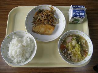 本日のメニューは、米粉パン、牛乳、アジのチーズフライ、キャベツのソテー、コーンスープでした。温かいコーンスープは今日のように冷える日にぴったりですね。