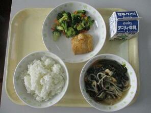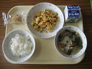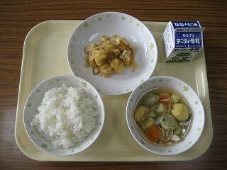 本日のメニューは、ご飯、牛乳、さつま汁、厚揚げの甘辛炒めでした。