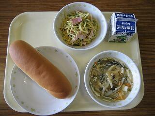 本日のメニューは、減量ミルクパン、牛乳、冷やし中華、わかめスープでした。