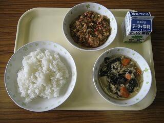 本日のメニューは、ご飯、牛乳、アーモンドとピーマンの肉みそ丼、具だくさん汁でした。肉みそ丼はお肉がいっぱい入ってて、夏ばて防止にはぴったりですね。