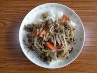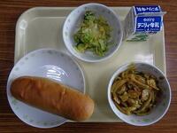マヨネーズパン、いためビーフン、ごぼうだんごスープ、牛乳
