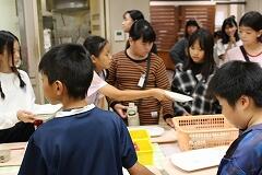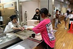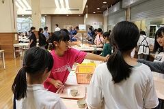 【「協同」の気持ちがあふれる配膳・片付け】 配膳のカウンターでは、たくさんの「協同」の気持ちがあふれる場面が見られました。「お味噌汁、熱いから気をつけてね。」「このおかず、どうやって取るの?」「このお皿、僕が運ぶよ」といった声が飛び交い、列に並んでいる友だちの食器を取ってあげたり、おかずの取り方をアドバイスしたり。お互いを気遣い、助け合う姿は、3校がすっかり一つになっていることを物語っていました。