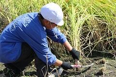 まずは、JA青年部の方から鎌の正しい使い方や、稲を刈るときの注意点についてご指導いただきました。子どもたちは、初めて手にする鎌に少し緊張した様子でしたが、すぐに真剣な表情に変わります。「稲の根本をしっかり持って、一気に刈るんだよ。」というアドバイスを受け、いざ田んぼへ。