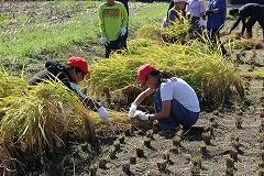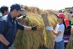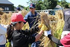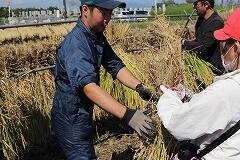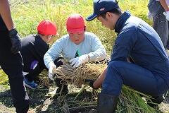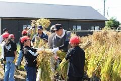 稲を刈り取った後は、次なる大切な作業、束ねて結ぶ作業、そして「掛け干し」です。刈り取った稲は、JA青年部の皆さんと一緒に太い束にし、紐でしっかりと結びます。