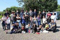 【サバンナを背景に記念撮影】 お腹がいっぱいになった後は、最後の見学地「平川動物公園」へ。まず、アフリカのサバンナを思わせる雄大な景色を背景に、全員で集合写真をパシャリ!太陽の下、子どもたちの顔は達成感と期待に満ちあふれていました。