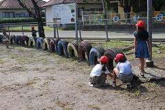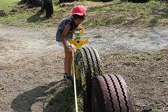 【驚きと発見!長さに気づく瞬間】 たくさんのものを測る中で、特に子どもたちが驚き、「長さの量感」を強く感じたのは、クライミングロープの斜面の長さと、タイヤ遊具の全体の長さでした。クライミングロープの斜面や、タイヤを並べた遊具の全長を測り終わった時、巻き尺に示された数字を見て、こんな声が上がりました。