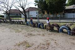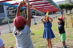 【測ってみよう!学校の長いもの】 班に分かれて、自分たちが興味を持った場所の長さを真剣に計測しました。「せんだんの木の幹の周囲」、「ネットの長さ」、「サッカーゴールの横幅」、「ろく木の横幅や高さ」、「タイヤ遊具の列の長さ」、「 うんていの長さ」など、巻き尺をピンと張ったり、曲がっているものを曲線に合わせて測ったりと、協力しながら正確に測る工夫をしていました。