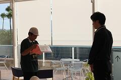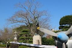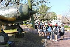 【厳しい現実を伝える展示】 会館の外には、特攻作戦に使用された戦闘機が展示されており、子どもたちはその巨大さと、これが「片道燃料」のみを積み、二度と帰らぬ出撃に使用された事実を前に、驚きと戸惑いを覚えた様子でした。また、特攻隊員の像「とこしえに」は、出撃する兵士の姿と、彼を見送る母の姿を表しています。国を思い、父母を思いながら散っていった若者たちの悲痛な思いが込められており、子どもたちも足を止めて見つめていました。