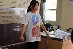 【姿勢が体に与える影響を視覚的に理解】 先生はまず、内臓のイラストが描かれた特製のTシャツを着用して登場しました。このTシャツを使い、背中を丸める猫背の姿勢になると、内臓が圧迫されてしまい、お腹が痛くなったり、消化が悪くなったり、集中力が続かなくなったりといった不調につながることを、視覚的に説明してくださいました。