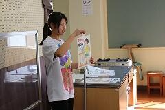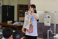 子どもたちは、Tシャツのイラストで内臓の位置を確認し、「えー!お腹が潰れちゃうの!?」「だから姿勢が悪いと気持ち悪くなるんだ」と驚き、真剣な表情で話に聞き入っていました。