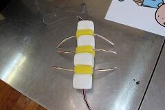 【手作り「背骨モデル」で良い姿勢を意識】 さらに、先生は発泡スチロール、黄色のスポンジ、ワイヤー(針金)で作られた手作りの「背骨の模型」を使って、より具体的に姿勢の指導をされました。
