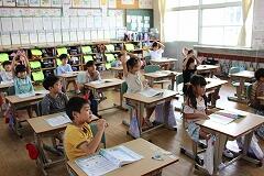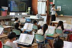 次に歌ったのは「やまびこごっこ」という曲です。この曲は、やまびこのように言葉を2回ずつ繰り返すのが面白いところ。「やっほー」と呼びかけるように歌うと、「やっほー」と返す元気な歌声が教室中に響き渡ります。「本物のやまびこより元気かも!」「もっと大きな声で言ってみよう!」と、CDに合わせて楽しそうに歌う子どもたち。まるで本当の山にいるかのように、生き生きとした歌声が学校中にあふれていました。