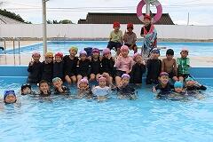 【プールさん、ありがとう!】 最後に、この夏の間、たくさん楽しませてくれたプールに「ありがとう」のお礼を言って、記念写真を撮りました。 子どもたちの笑顔と成長が、プールの水面にキラキラと輝いていました。 また来年も、元気にプールで遊べますように!