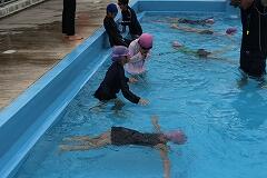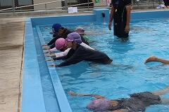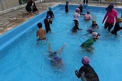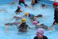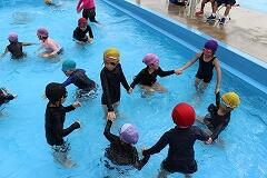 1・2年生のこれまでの水泳学習で、たくさんのことができるようになりました。 まずは、水の中をカニやアヒル、ワニになって歩く練習。 次は、だるまや大の字になって浮く練習です。