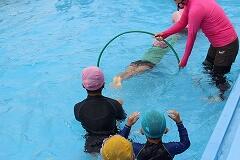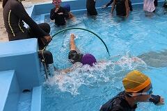 【宝探しに大冒険・リングの中をくぐって冒険だ!】 後半の学習では、プールサイドに置かれたリングに向かって体を伸ばし、くぐり抜ける練習です。 「おーい!僕、一番にリングの中を通るよ!」 「私も!私も!」 子どもたちは目を輝かせながら、楽しそうに次々とリングの中をくぐっていきます。 そして、この日のハイライトは、プールに沈んだ「お宝」を探すゲーム。 1年生と2年生に分かれてチーム対抗戦です。 「あっちにあった!」「こっちにもあるよ!」 みんな夢中になってお宝を拾い集め、結果は1勝1敗の引き分け! 大盛り上がりのゲームとなりました。