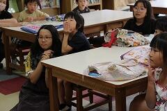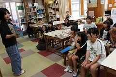 【親子で挑戦!特別な読み聞かせ】 特に中学年の教室では、いつもとは一味違った、心温まる特別な読み聞かせがありました。なんと、今回ボランティアとしてご協力くださったのは、この教室に通う児童のお母さんと、その親子ペアです。2人が選んでくれたのは、長谷川義史さんの楽しい絵本『たこやきのたこさぶろう』。ボランティアのお母さんが、たこさぶろうの気持ちになって語りかける優しい声と、時にユーモラスな登場人物の声を使い分ける表現力豊かな読み方に、子どもたちはすぐに引き込まれました。そして、娘さんもお母さんの隣に立ち、絵本をしっかり持って、時にページの絵を指さしながら、息の合った様子でサポートします。親子で読み聞かせをするという貴重な体験に、娘さんの表情も真剣そのもので、お母さんを支えようとする姿が印象的でした。