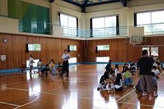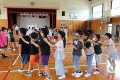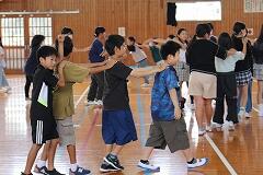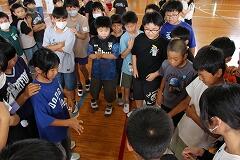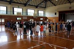 緊張が解けたところで、全体でのレクリエーション「じゃんけん列車」の始まりです。「やったー、つながった!」「すごい長い列車になったね!」と、体育館のフロアいっぱいに大きな列車の輪ができあがりました。勝敗に関わらず、ハイタッチや笑顔で喜びを分かち合う様子は、まさに「友愛」の心を育む時間となりました。写真にあるように、子どもたちの自然な笑顔があふれる時間となりました。