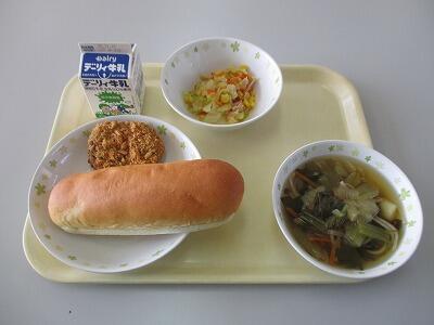 今日のメニューは、お豆とかぼちゃのコロッケ、キャベツのソテー、チンゲンサイのスープチーズパン、牛乳です。