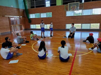 次に、運動場に移動して、ジェスチャーリレーゲームです。ジェスチャーだけで、お題をうまく伝えるって難しいですね。子ども達も苦労していましたが、みんなで力を合わせて答えを当てました。