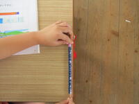 ゴムを5cm伸ばすと、2m。ゴムを10cm伸ばすと、4m。ゴムを15cm伸ばすと、6mほど進みました。最後に6m進んだ時には、子ども達からも「わぁっ。」と歓声が起こりました。ゴムを引っ張るだけで、車が何mも進むことが、信じられない様子でした。