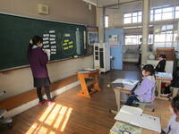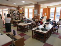 4年生は、国語辞典を使っての学習でした。先生が黒板に書いた漢字を見つけるスピードをグループで競い合っていました。早く見つけた人が同じグループの人のそばに行き教えていました。