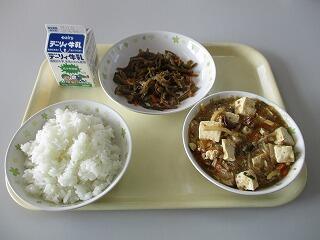 今日のメニューは、茎わかめのきんぴら、マーボー豆腐、白ご飯、牛乳です。
