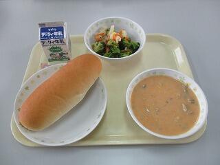 今日のメニューは、あじのチーズフライ、キャベツのサラダ、なめこ汁、白ごはんです。あじのフライがさくさく揚がっています。2学期も残すところわずかとなりました。毎日登校できるように健康管理を学校と家庭で気をつけていきましょう。