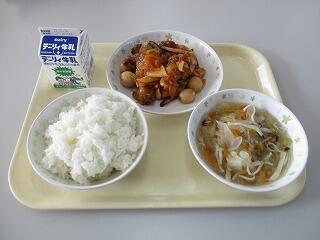 今日のメニューは肉野菜炒めと、かぼちゃのみそ汁、白ごはんです。今日は六年生の調理実習があり、グループごとに卵などを使った調理をしていました。一班の子どもたちが試食にともってきてくれたお好み焼きと,みそ汁を本日の給食の横に並べさせていただきます。とってもおいしかったです。