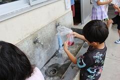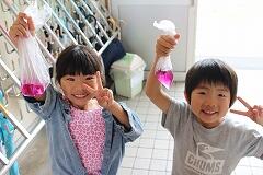 【ふわふわ、ひんやり、五感で楽しむ発見がいっぱい!】 出来上がった色水を、友達と見せ合ったり、色の濃さを比べたり。「私のはもっと濃いよ。」「私のはピンク色。」と、自分だけの「あさがお色の魔法水」に大満足の様子。さらに、「袋、ふわふわする!」「ひんやりして気持ちいいね!」と、ビニール袋の感触や、水の冷たさを確かめ合う姿も。五感をフルに使って、色水づくりを楽しんでいました。あさがおの花がくれた素敵なプレゼント。この活動は、子どもたちの色彩感覚を豊かに育むだけでなく、色の変化を観察する力や、どうすれば色が濃くなるかといった思考力を育む貴重な機会となりました。身近な植物が生活に結びつく喜びを感じながら、子どもたちはたくさんの発見と学びを得たようです。自分たちで作った世界に一つだけの色水は、きっと子どもたちの心に、夏の楽しい思い出として深く刻まれたことでしょう。
