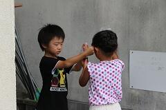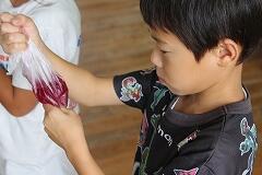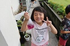 【モミモミ、ユラユラ、色が変わる不思議!】 まずは、摘み取ったあさがおの花をビニール袋に入れます。そこに、そーっとお水を加えて、いよいよ「魔法の呪文」を唱える時間…「モミモミ、モミモミ!」子どもたちは、袋の中の花と水を、真剣な表情で、そして時にはくすぐったそうにモミモミします。するとどうでしょう!みるみるうちに透明だった水が、鮮やかなピンク色や紫色に染まっていきます。 「わぁ!色が変わった。」「きれいな色になったよ。」あちこちから歓声が上がります。自分の手から生まれた美しい色水に、子どもたちの目はキラキラ。 好きなだけ水を足して、さらにモミモミ。「もっと濃い色にしたい。」「薄いピンクもかわいいね。」と、思い思いの色を追求していました。