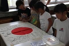 【戦争の遺品から平和を学ぶ】 全校集会後、子どもたちは遺族会の方々からお借りした戦争に関する遺品を見学しました。展示された資料の中には、戦時中の人々が身につけていたとされる貴重品袋や、緊急招集令状(赤紙)などが並べられていました。