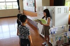 次に、8月6日の広島原爆の日、9日の長崎原爆の日、15日の終戦記念日が日本にとって大切な日であることを説明し、80年前の戦争、特に都城への空襲について語りました。当時の都城が標的になった理由や甚大な被害に触れ、空襲後の写真(都城市HPより参照)も共有されました。さらに、「沖縄慰霊の日」(6月23日)に毎年朗読される「平和の詩」について紹介があり、今年は6年生の城間さんの詩の映像を全校で見ました。続いて、絵本「へいわってすてきだね」(詩: 安里有生、画: 長谷川義史、出版社: ブロンズ新社)が紹介され、この絵本は12年前、当時小学1年生だった安里有生さんの詩がもとになっていることが説明されました。校長先生は絵本を読み聞かせ、戦争で失われた尊い命を大切にするためにも、「小さな平和」をたくさんつくることの重要性を強調しました。「小さな平和」は「人を大切にする力」と「自分の考えをもつ力」でつくられると述べ、子どもたちに「笑顔いっぱいのかしのっ子になれることを願っています」と伝えました。