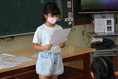 本日、1学期終業式が執り行われ、子どもたちはこの4か月間の成長と学びを振り返りました。式では、4年生と5年生の代表児童が、1学期を振り返っての発表を行いました。二人は、発表力や計算力の向上、そして「キーボー島アドベンチャー」でのタイピング練習に粘り強く取り組み、目標級を達成できたことなど、「最初は難しかったけれど、諦めずに練習したらスラスラ打てるようになったんです!」と努力の成果と達成感を生き生きと発表しました。また、「夏休みには、もっと色々な本を読んでみたいです。」といった、これから始まる夏休みへの大きな期待と希望が感じられ、聞いている児童たちも真剣な眼差しで耳を傾けていました。