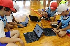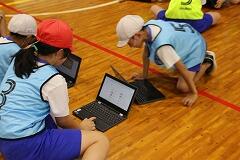 【作戦が活きる!白熱の試合展開】 作戦タイムが終了すると、再び試合です。タブレットで練り上げた作戦を胸に、子どもたちは真剣な表情でコートに立ちました。先ほど話し合ったポジションを確認し、ボールが来るたびに声を掛け合い、懸命にボールを追います。作戦がうまくいき、見事得点が入った時には、チーム全員で喜びを分かち合う姿が見られました。また、作戦通りにいかなかった時も、すぐにチームで声を掛け合い、次の一手を考えているようでした。このように、子どもたちは作戦を立てる生き生きとした表情と、それを実行しようと懸命にプレーする姿を見せてくれました。仲間と力を合わせて競い合う楽しさや喜びを味わいながら、ボール操作の技術だけでなく、自己やチームの課題を見つけ、その解決のために考え、協力する力を大きく伸ばしています。