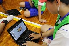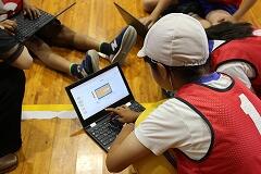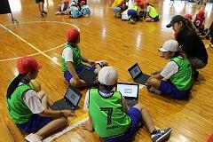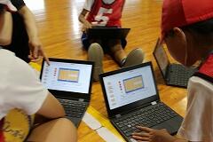 【タブレットを活用した「作戦タイム」が白熱!】 特筆すべきは、試合と試合の間に設けられた「作戦タイム」です。子どもたちは、床に座り、各自のタブレットを開いていました。そこには、Googleスライドで作成されたコートのシートが表示されています。写真にあるように、子どもたちはそのシート上で、自分たちのチームの3人のポジションを動かしながら、活発に意見を出し合っていました。「次はここにパスを出す!」「相手のこの位置が空いているから狙おう!」といった声が聞こえてきます。チームでシートが共有されているため、自分のタブレットで見ながら友達の意見に真剣に耳を傾け、より良い作戦を練ろうとする姿が見られました。そして、ポジションや動きの確認が終わると、代表児童が文章で具体的な作戦を記入していきます。共同編集機能があるため、一人が書き始めると、それに気づいた他の子が言葉を追加したり、より適切な表現に修正したりする場面も見られました。保護者の皆様も、子どもたちがICT機器を使いこなして共同で課題解決に取り組む様子に、大変驚かれていました。