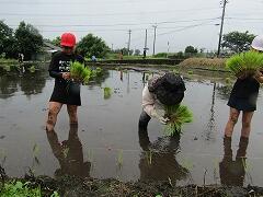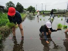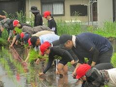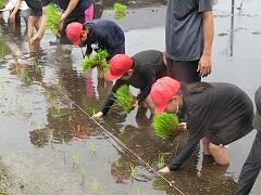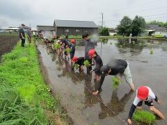 6月12日(木)の「どろんこドッジボール」から約2週間。6月25日(水)、5年生は庄内地区のJA青年部の皆様、そよ風グループの皆様のご協力のもと、待ちに待った田植え体験を行いました。曇り空で田植えには絶好のコンディションの中、子どもたちは現地に到着。最初は、小さな苗をちぎる作業に戸惑う姿も見られましたが、JA青年部の方々や保護者の皆様からの丁寧な手ほどきを受け、すぐに慣れていきました。