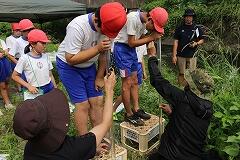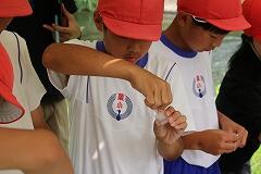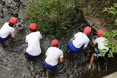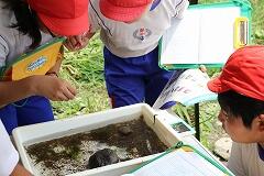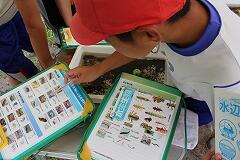 さらに、川にどんな生き物がいるのかも調査しました。バットに入れた川の水と石をじっと見つめ、「あ、何か動いた!」「この虫、初めて見た!」と、目を凝らして観察します。採取した生き物の個体数を数えたり、どんな種類の生き物かを図鑑と照らし合わせたりと、協力しながら真剣に取り組んでいました。「ムカシトンボ」、「ゲンジボタル」のようにきれいな水にしか生息しない生き物を発見し、大喜びする姿も!子どもたちが調査した丸谷川の水質は、なんと4段階の総合判定で最高の『きれいな水』でした!「丸谷川って、こんなにきれいな川だったんだね!」「このきれいな水、ずっと守っていきたいね。」