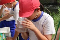 次に水の透明度を測る調査です。メモリのついた透明な管に川の水を入れ、目印がどのくらいの距離まで見えるかを測定します。「もっと奥まで見えるよ!」「すごい、すごく透明だね!」子どもたちの驚きの声が上がります。「わぁ、水が冷たくて気持ちいい!」「あれ、この水、どんな匂いがするんだろう?」容器に入れた水のにおいを嗅ぐ調査も行いました。
