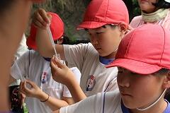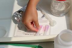 そして、いよいよ前回学習した水質調査、COD(水の中に含まれる汚れの度合いを表す検査)に挑戦! 「この試薬を入れると、色が変わるんだよね?」「どんな色になるかな?」わくわくしながら試薬を投入する子どもたち。「見て!ピンク色になったよ!」「やった!きれいな水だ!」試薬が『きれいな水』を示すピンク色に変化した瞬間、声が高まりました。