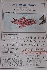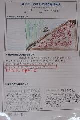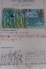 子どもたちは、作成した紹介カードを提示しながら、自分の言葉で選んだ場面の魅力を友達に伝え、活発な意見交換が行われました。発表の後は、友達の発表を聞いて感じたことをコメントカードに記入したり、直接感想を伝え合ったりして、互いの感じ方を共有しました。発表を終えた子どもたちがとても嬉しそうな、満足げな表情をしていたのが印象的でした。物語の感動を分かち合い、友達の言葉に耳を傾けることで、子どもたちは「スイミー」の世界をさらに深く味わうことができたようです。