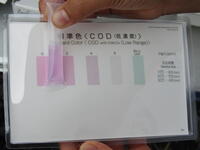 まず、目を閉じて1分間静かに自然の音に耳を澄ませました。川の音や鳥の鳴き声、風で葉が揺れる音などが聴こえました。次に、透視度計やCODパックテストを使い、水のきれいさを調べました。結果を見ると、いちばんきれいな水を表すピンク色に変化しました。最後に、川の中に住む水生生物を調べました。ブユ、アミカ、カワゲラ、ヒラタカゲロウなどの生き物を見つけました。きれいな川で生きる生き物ばかりです。