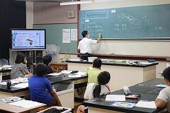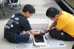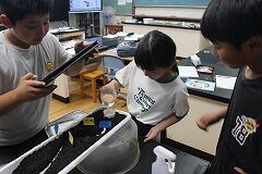 理科室では5年生が、『流れる水のはたらき』の学習をしていました。流れる水には、どのような働きがあるのか予想をして実験で確かめる2時間連続の学習です。先日、宮崎県では線状降水帯が発生し、大量の水があふれ日常生活が脅かされることがありました。そのことを想起させながら、流れる水には地面を侵食したり、土などを運搬したり、たい積させたりするはたらきがあることを予想して実験装置を作り検証していました。特に動画は繰り返し見ることができるので、担当になった児童はどこを撮影するのか班のみんなと確かめて実験を行いました。実験後にはタブレットを用いて侵食・運搬する部分を動画撮影した資料、たい積した土を写真撮影した資料などを見直して、自分たちが予想したことが正しかったのか話し合うときに大変役立っていました。